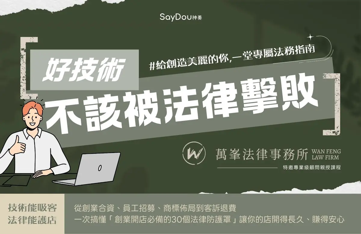 技術再好,別讓「不懂法律」成為你倒店的最後一根稻草。 👉🏻 專為「創造美麗服務」的經營者量身打造 創業開店,看似光鮮亮麗,但只要一份合約簽錯、一條法規不懂,你辛苦累積的獲利可能瞬間消失。從創業合資、員工招募、商標佈局到客訴退費。一次搞懂「創業開店必備的 30個法律防護罩」,讓你的店開得長久、賺得安心。 這些場景,你也許不陌生,甚至正在經歷... 合夥變仇人 當初說好一起打拚,生意好了卻為了分潤吵翻天?或者合夥人突然退股,要求把資金全部抽走,店面瞬間週轉不靈? 設計師帶客跑 培養兩年的設計師,離職後直接在隔壁開店,還把你的 VIP 客戶名單全帶走,你的競業禁止條款真的有效嗎? 奧客退費糾紛 買了10堂課,用了2堂說不滿意要「全額退費」。不退就威脅找消保官、上網留負評。你手上的合約能保護你嗎? 你以為只要技術好、服務好就沒事? 只要一份合約簽錯、一條法規不懂,你幾年的獲利可能一次賠光! 別擔心,法律不是為了打官司,而是為了「預防踩雷」! 這不是枯燥乏味的法律系課程。 我們將生硬的法條,翻譯成美業經營者聽得懂的語言。這堂課濃縮了 「創業籌備」 到 「營運成熟期 」的精華,整理出 「30 個創業最容易陣亡的法律陷阱」,並提供你「拿來就能用」的解決方案。 我有興趣!前往報名 ► 課程大綱 這堂課,你將獲得全方位的開店必備法律防護網 第一章: 創業地基篇|合資與租賃 ◼︎合夥契約怎麼簽?出資、技術股、分潤機制完全解析。◼︎[關鍵] 拆夥機制:當理念不合時,如何好聚好散,保住店面?◼︎租賃合約魔鬼細節:二房東、裝潢期與解約賠償。 第二章: 團隊管理篇|勞資與人才 ◼︎僱傭 vs. 承攬(租位/掛靠):合約簽錯的勞健保補繳風險。◼︎[熱門] 競業禁止條款:如何防止員工離職後搶客?◼︎學徒制、試用期與資遣費的合法操作界線。 第三章: 品牌防禦篇|廣告與智財 ◼︎店名與 Logo 被搶註怎麼辦?商標佈局策略。◼︎作品集歸屬:離職設計師可以帶走客人的照片嗎?◼︎[警示] 廣告行銷紅線:避開「誇大不實」與「醫療效能」的高額罰單。 第四章: 金流銷售篇|票券與預付 ◼︎儲值卡、課程券合法販售規範(履約保證)。◼︎[必學] 如何計算退費:客人中途退課,如何扣除贈品與手續費?◼︎定金與預約取消(No-show)的沒收比例上限。 第五章: 糾紛實戰篇|客訴與危機 ◼︎免責聲明書有效嗎?燙傷、過敏、受傷的賠償責任。◼︎面對網路惡意負評、妨害名譽的蒐證與提告流程。◼︎消保官找上門怎麼辦?消費爭議調解 SOP。 我有興趣!前往報名 ► 講師介紹 美業最強法律顧問 萬峯法律事務所主持律師|蕭萬龍 ◼︎輔導超過50+間美業品牌,涵蓋知名髮品商、美髮沙龍、各美業連鎖品牌,進行法務諮詢。◼︎曾任亞洲大學、清雲大學講師◼︎桃園市政府勞動局勞資爭議調解委員◼︎桃園市榮民服務處法律顧問◼︎桃園市藥師公會法律顧問 常見問題 我是個人工作室(獨資),也需要懂這些嗎? A:絕對需要!個人工作室抗風險能力較低,遇到一次惡意退費或買賣糾紛,賠償金可能就是你一整年的獲利。 法律條文很難懂,我怕聽不懂? A:別擔心,課程全程不背法條,我們用「真實案例」教學,並教你如何直接套用範本。 如果不是美業的店家,也能參與嗎? A:可以!律師提供的內容都能適用全產業別,如有在課程上強調「某一產業」適用時再請留意,不影響整體課程。 現場可以提問嗎? A:可以!報名時會請您提供想詢問的問題,在課程最後也會提供大家QA提問時間,解決您的問題,若複雜牽涉隱私或複雜問題關係,建議另外個別諮詢。 課程有包含醫美診所的法規嗎? A:本課程主要針對「生活產業別」,若您是醫美診所涉及更嚴格的醫療法,建議另外諮詢。 學員反饋心得 之前遇到設計師集體離職還帶走客人,當時真的求助無門。上完這堂課才發現我的合約漏洞百出,幸好現在有了老師提供的範本,終於可以安心睡覺了! 對於常見的儲值金、票券販售,一直以來自己都只是在賣,不知道如何保障自己?自從上了蕭律師的實體課程後,知道該在什麼時候告知消費者、在票券上標註哪些內容,以利保障雙方權益,實在太好用了!現在面對奧客退費,我可以理直氣壯地拿出合約與法規。 曾經與股東鬧出糾紛,更是撕破臉,再次創業,不會讓自己再犯一樣的錯。上完這堂課,有老師由淺入深的案例分析,才發現原本的合股模式有很多不足的地方,現在有了老師提供的範本,應該降低自己重蹈覆徹的風險,感謝。 課程花絮 用活潑生動方式詮釋個案,帶您輕鬆了解美業常見的法務QA 美業必修法務課|課程資訊 3月課程|台南場🗓日期|2026.03.16 (一)🕰時間|10:30~13:30 (10:00開始進場、13:00-13:30為QA時間沒提問將提早結束)📍地點|台南市北區成功路294號5樓 5月課程|桃園場 🗓日期|2026.05.18 (一) 🕰時間|10:30~13:30 (10:00開始進場、13:00-13:30為QA時間沒提問將提早結束) 📍地點|桃園市中壢區延平路366號4樓 *此優惠限線上繳費,現場報名者恕不提供優惠。 上完課,這些「保命工具」直接讓你帶回家! ▶︎ 市價超過 $15,000 的律師擬定範本,只送不賣 ✅ 萬用合夥契約範本 (條列出資、分潤、拆夥條款)✅ 勞動/承攬契約書 (清楚界定雙方權利義務)✅ 顧客肖像權使用同意書 (讓你安心使用對比照做行銷)✅ 免責聲明與服務同意書範例✅ 【神器】讓系統重要時刻保障您!首次簽約報名
