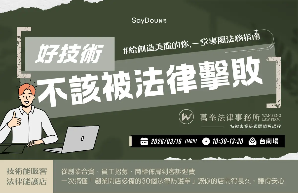 技術再好,別讓「不懂法律」成為你倒店的最後一根稻草。 👉🏻 專為「創造美麗服務」的經營者量身打造 創業開店,看似光鮮亮麗,但只要一份合約簽錯、一條法規不懂,你辛苦累積的獲利可能瞬間消失。從創業合資、員工招募、商標佈局到客訴退費。一次搞懂「創業開店必備的 30個法律防護罩」,讓你的店開得長久、賺得安心。 這些場景,你也許不陌生,甚至正在經歷... 合夥變仇人 當初說好一起打拚,生意好了卻為了分潤吵翻天?或者合夥人突然退股,要求把資金全部抽走,店面瞬間週轉不靈? 設計師帶客跑 培養兩年的設計師,離職後直接在隔壁開店,還把你的 VIP 客戶名單全帶走,你的競業禁止條款真的有效嗎? 奧客退費糾紛 買了10堂課,用了2堂說不滿意要「全額退費」。不退就威脅找消保官、上網留負評。你手上的合約能保護你嗎? 你以為只要技術好、服務好就沒事? 只要一份合約簽錯、一條法規不懂,你幾年的獲利可能一次賠光! 別擔心,法律不是為了打官司,而是為了「預防踩雷」! 這不是枯燥乏味的法律系課程。 我們將生硬的法條,翻譯成美業經營者聽得懂的語言。這堂課濃縮了 「創業籌備」 到 「營運成熟期 」的精華,整理出 「30 個創業最容易陣亡的法律陷阱」,並提供你「拿來就能用」的解決方案。 我有興趣!前往報名 ► 課程大綱 這堂課,你將獲得全方位的開店必備法律防護網 第一章: 創業地基篇|合資與租賃 ◼︎合夥契約怎麼簽?出資、技術股、分潤機制完全解析。◼︎[關鍵] 拆夥機制:當理念不合時,如何好聚好散,保住店面?◼︎租賃合約魔鬼細節:二房東、裝潢期與解約賠償。 第二章: 團隊管理篇|勞資與人才 ◼︎僱傭 vs. 承攬(租位/掛靠):合約簽錯的勞健保補繳風險。◼︎[熱門] 競業禁止條款:如何防止員工離職後搶客?◼︎學徒制、試用期與資遣費的合法操作界線。 第三章: 品牌防禦篇|廣告與智財 ◼︎店名與 Logo 被搶註怎麼辦?商標佈局策略。◼︎作品集歸屬:離職設計師可以帶走客人的照片嗎?◼︎[警示] 廣告行銷紅線:避開「誇大不實」與「醫療效能」的高額罰單。 第四章: 金流銷售篇|票券與預付 ◼︎儲值卡、課程券合法販售規範(履約保證)。◼︎[必學] 如何計算退費:客人中途退課,如何扣除贈品與手續費?◼︎定金與預約取消(No-show)的沒收比例上限。 第五章: 糾紛實戰篇|客訴與危機 ◼︎免責聲明書有效嗎?燙傷、過敏、受傷的賠償責任。◼︎面對網路惡意負評、妨害名譽的蒐證與提告流程。◼︎消保官找上門怎麼辦?消費爭議調解 SOP。 我有興趣!前往報名 ► 講師介紹 美業最強法律顧問 萬峯法律事務所主持律師|蕭萬龍 ◼︎輔導超過50+間美業品牌,涵蓋知名髮品商、美髮沙龍、各美業連鎖品牌,進行法務諮詢。◼︎曾任亞洲大學、清雲大學講師◼︎桃園市政府勞動局勞資爭議調解委員◼︎桃園市榮民服務處法律顧問◼︎桃園市藥師公會法律顧問 常見問題 我是個人工作室(獨資),也需要懂這些嗎? A:絕對需要!個人工作室抗風險能力較低,遇到一次惡意退費或買賣糾紛,賠償金可能就是你一整年的獲利。 法律條文很難懂,我怕聽不懂? A:別擔心,課程全程不背法條,我們用「真實案例」教學,並教你如何直接套用範本。 如果不是美業的店家,也能參與嗎? A:可以!律師提供的內容都能適用全產業別,如有在課程上強調「某一產業」適用時再請留意,不影響整體課程。 現場可以提問嗎? A:可以!報名時會請您提供想詢問的問題,在課程最後也會提供大家QA提問時間,解決您的問題,若複雜牽涉隱私或複雜問題關係,建議另外個別諮詢。 課程有包含醫美診所的法規嗎? A:本課程主要針對「生活產業別」,若您是醫美診所涉及更嚴格的醫療法,建議另外諮詢。 學員反饋心得 之前遇到設計師集體離職還帶走客人,當時真的求助無門。上完這堂課才發現我的合約漏洞百出,幸好現在有了老師提供的範本,終於可以安心睡覺了! 對於常見的儲值金、票券販售,一直以來自己都只是在賣,不知道如何保障自己?自從上了蕭律師的實體課程後,知道該在什麼時候告知消費者、在票券上標註哪些內容,以利保障雙方權益,實在太好用了!現在面對奧客退費,我可以理直氣壯地拿出合約與法規。 曾經與股東鬧出糾紛,更是撕破臉,再次創業,不會讓自己再犯一樣的錯。上完這堂課,有老師由淺入深的案例分析,才發現原本的合股模式有很多不足的地方,現在有了老師提供的範本,應該降低自己重蹈覆徹的風險,感謝。 課程花絮 用活潑生動方式詮釋個案,帶您輕鬆了解美業常見的法務QA 美業必修法務課|課程資訊 3月課程|台南場🗓日期|2026.03.16 (一)🕰時間|10:30~13:30 (10:00開始進場、13:00-13:30為QA時間沒提問將提早結束)📍地點|台南市北區成功路294號5樓 *此優惠限線上繳費,現場報名者恕不提供優惠。 上完課,這些「保命工具」直接讓你帶回家! ▶︎ 市價超過 $15,000 的律師擬定範本,只送不賣 ✅ 萬用合夥契約範本 (條列出資、分潤、拆夥條款)✅ 勞動/承攬契約書 (清楚界定雙方權利義務)✅ 顧客肖像權使用同意書 (讓你安心使用對比照做行銷)✅ 免責聲明與服務同意書範例✅ 【神器】讓系統重要時刻保障您!報名費用可直接折抵系統費 報名流程 進入SayDou LINE官方帳號▸https://line.me/R/ti/p/@saydou‣ 點選圖文選單中課程報名‣ 選擇要報名的課程進入課程報名頁面步驟 